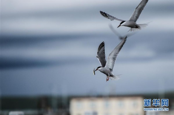 在中國最大內(nèi)陸咸水湖——青海湖,一只水鳥捕捉到湟魚后飛離水面(2015年6月24日攝)。
